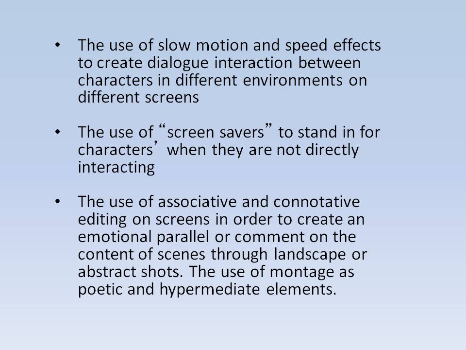 Mike Figgis’s Timecode, uses a looser sense of synchronised sound and is intended to be seen on a flat screen, unlike Echo, which is a surround experience.